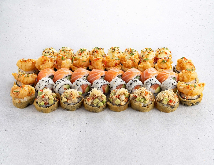 Для тех, кто верит: чем больше, тем лучше. И да, нас с вами таких много! Тут всё, что хочется пробовать один за другим: Филу, нежный ролл с лососем и креветкой, запеченные и темпура роллы. А ещё рассчитали на троих соевый соус, васаби, имбирь, палочки и влажные салфетки – чтобы было не только много вкусов, но и много заботы ❤️