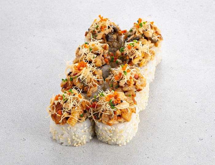 Однажды и навсегда — только такой исход может быть у встречи с этим роллом. В начинке одна нежность: сыр cremette, воздушный омлет и спелый авокадо. Сверху — много сочного угря и яркое трио соусов: пряный гриль, жгучий шичими и сладкий унаги. Завершающие штрихи: китайский перец, ароматный кунжут, свежий лук и хрустящее тесто катаифи.