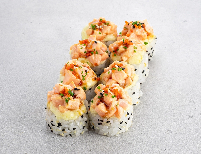 Атлантический лосось еще никогда не был так хорош. Нежный, сочный, с приятной дымной ноткой в послевкусии. В основе — сыр cremette, хрустящий огурчик и воздушный омлет тамаго. В эпицентре событий — лососевая шапочка с акцентными соусами: пряным гриль, сладким унаги и любимым сырным. Запекаем и украшаем ароматным кунжутом, китайским перчиком и свежим луком.