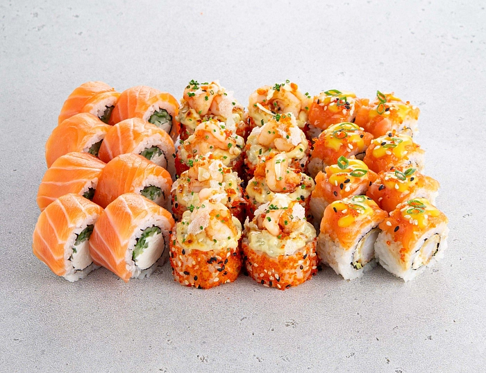 Небольшой набор вобрал в себя самое лучшее: от экзотических сочетаний хрустящей креветки и кисло-сладкого соуса манго, креветки и сыра горгонзола до нестареющей классики в лососе и угре.