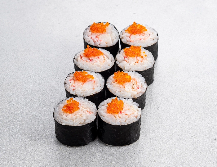 Мясо краба, снежный краб, рис, нори, икра тобико, чесночный соус