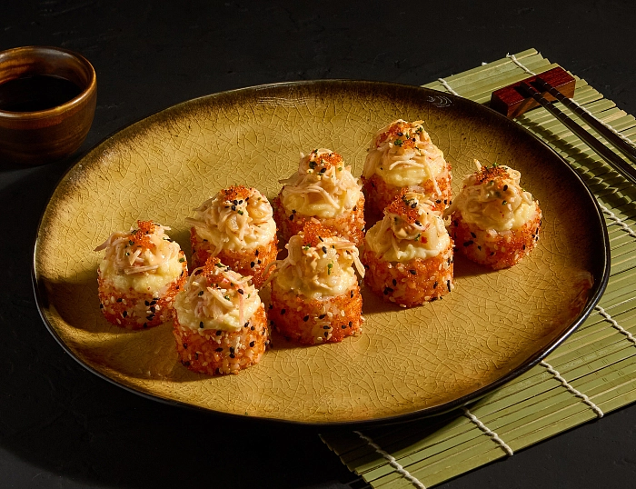 И остро, и нежно, и так сногсшибательно. А как иначе, когда в начинке мягкий сыр cremette, воздушный омлет и salmon skin? В румяной шапочке — снежный краб, нежный гребешок и сырный соус. Запекаем до золотистости, приправляем для пикантности соусом спайси, а для сладости — унаги. Остались детали: ароматный кунжут, любимая икра и свежий лук.