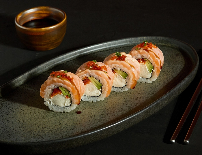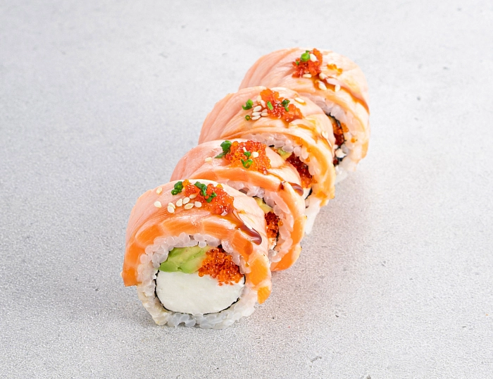 Любимая классика в своем новом и самом вкусном амплуа. Слайсы запеченного атлантического лосося создают нежное сочетание с мягким рисом, сыром cremette и спелым авокадо. Осталось лишь добавить ярких акцентов: пикантную икру тобико, сладковатый соус унаги, ароматный кунжут и свежий лучок.