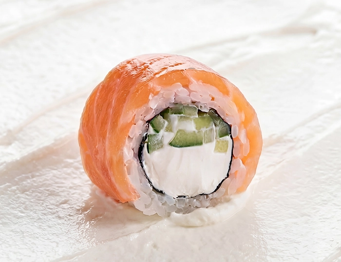 Классика с уникальным акцентом: атлантический лосось, мягкий рис, свежий огурец и нежный сыр без лактозы — чистое сочетание, где вкус раскрывается спокойно и точно.