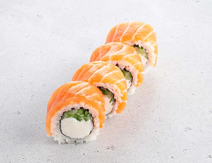 Ролл, который однажды возник в Америке и стал мировой классикой. Идеальный баланс вкуса благодаря сочетанию свежего атлантического лосося, риса, нежного сыра cremette и сочного огурца.