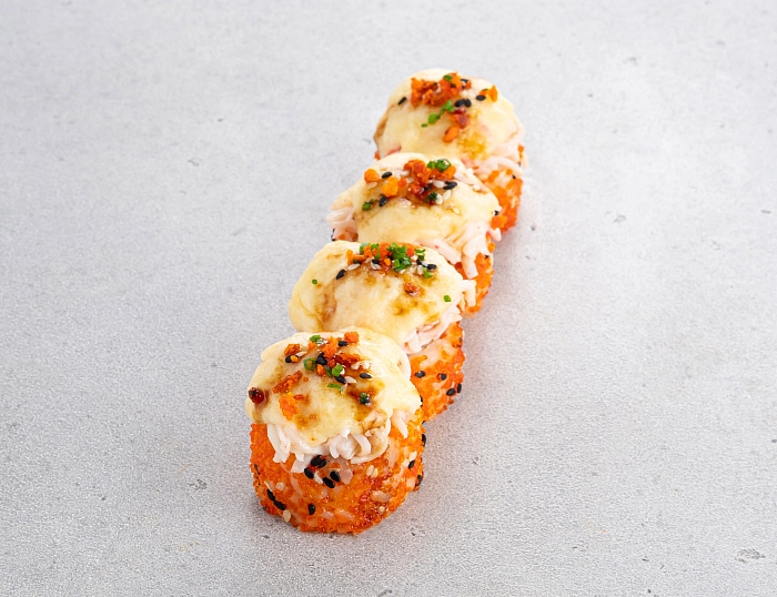 Рис, нори, снежный краб, соус айоли, пармезан, сливочный сыр, омлет тамаго, salmon skin, икра тобико, унаги соус, кунжут микс, китайский перчик, лук шнитт