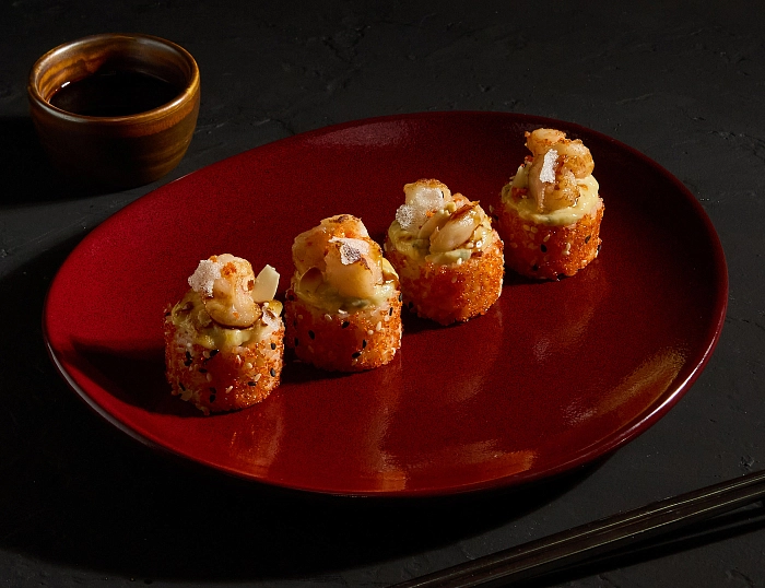 Один укус — и в вас просыпается гурман. А как иначе, когда в шапочке мясистая тигровая креветка и та самая горгонзола — нежная, сливочная, с пикантными нотками голубого сыра? Начинка ничуть не уступает: любимый сыр cremette, воздушный омлет тамаго и salmon skin. Запекаем до золотистости, приправляем сладким унаги и завершаем картину декором: перчиком, луком шнитт и арахисом.