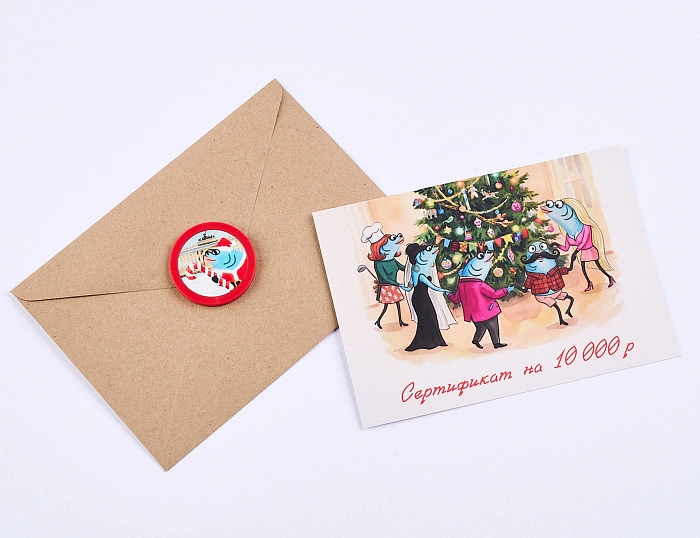 Не просто подарок, целая новогодняя история: сертификат на любимые роллы, праздничный конверт и vipfishka — сотрите ей скретч-зону, откройте промокод, и случится вкусная магия.